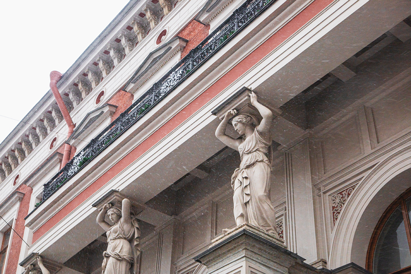 Проедем к одной из ранних работ Гаральда Боссе. Дом сохранил неизменные внешний вид и убранство. Здание постройки 40-х годов позапрошлого столетия включает элементы классицизма и неоренессанса. Это настолько удачный проект, что искусствоведы называют его «визитной карточкой зодчего». Облик вполне узнаваем, благодаря кариатидам на пилонах перед входом – фигуры поддерживают балкон второго этажа.