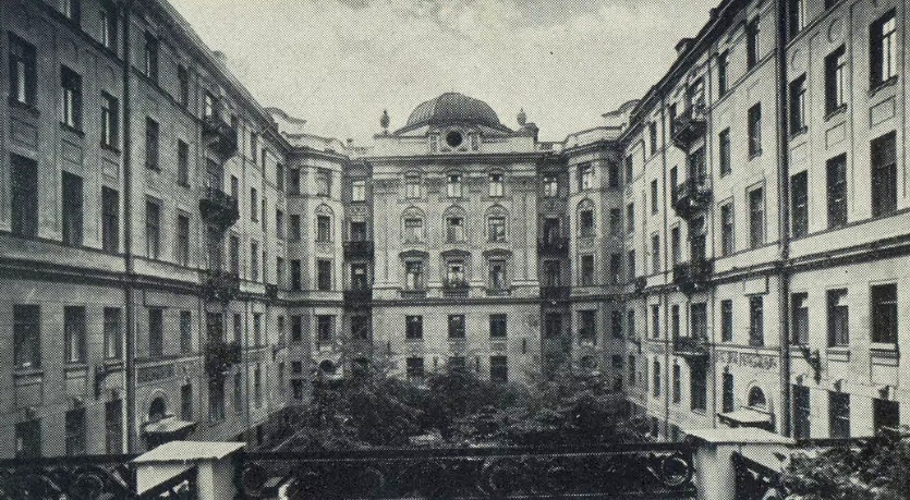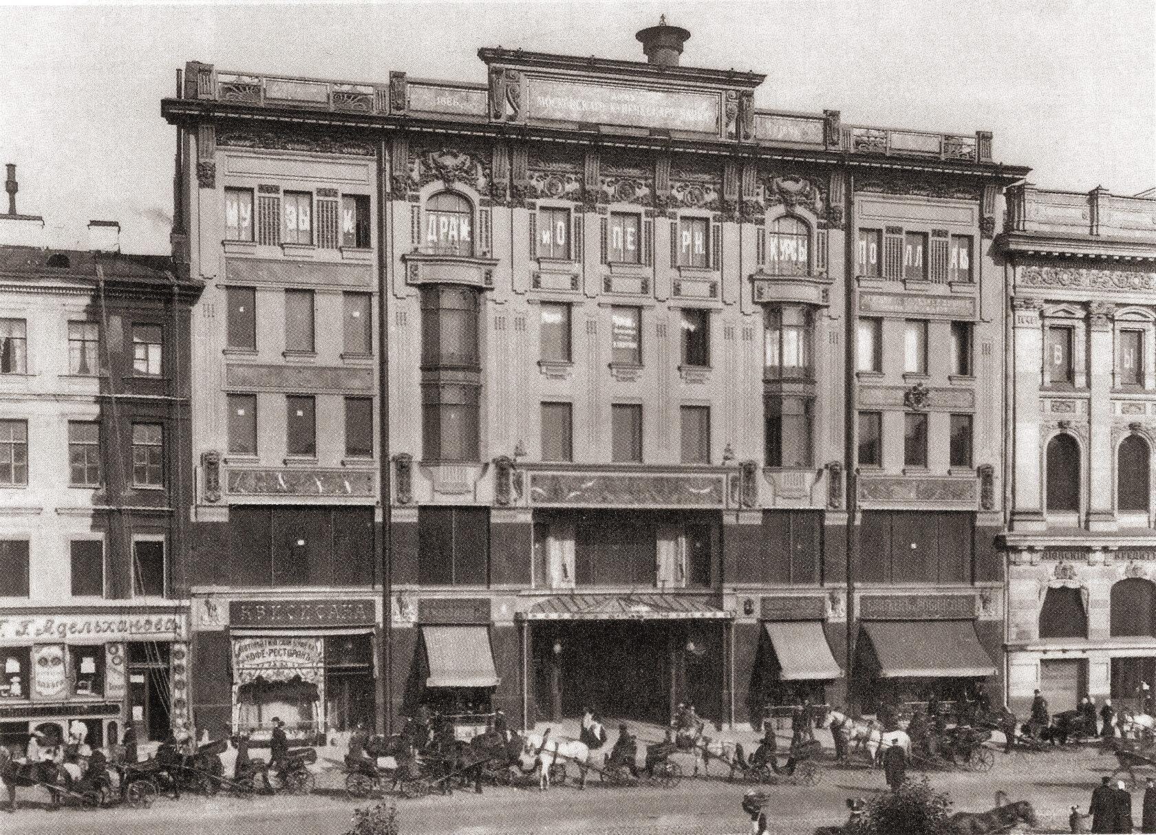 Как выглядит самое раннее сооружение стиля модерн на Невском проспекте? На этот вопрос мы ответим возле Московского купеческого банка, построенного по проекту Бенуа. Архитектор продумал все: от помещений под нужды банка во флигелях до фасада, где можно было разместить вывески арендаторов доходного дома. А внутри – чудо архитектурной мысли, большой операционный зал с прозрачным потолком.