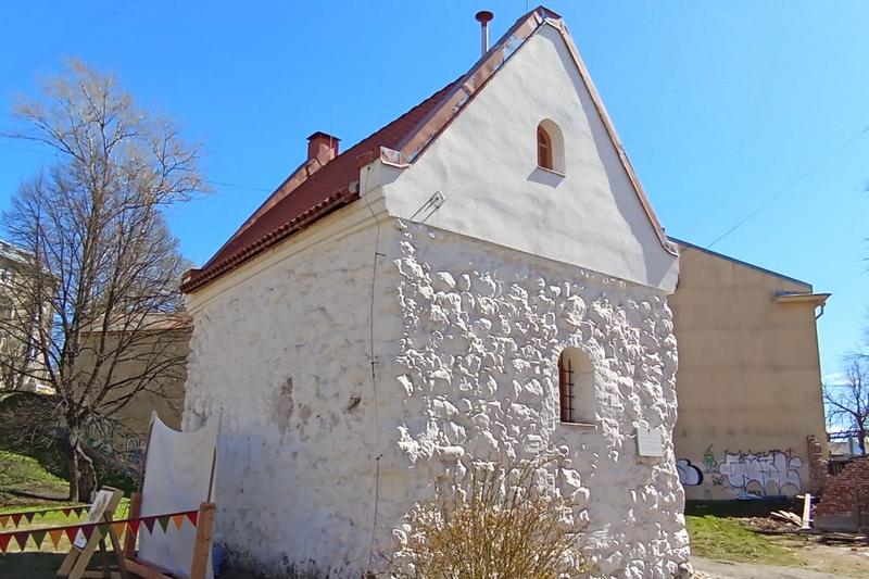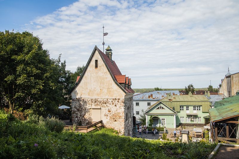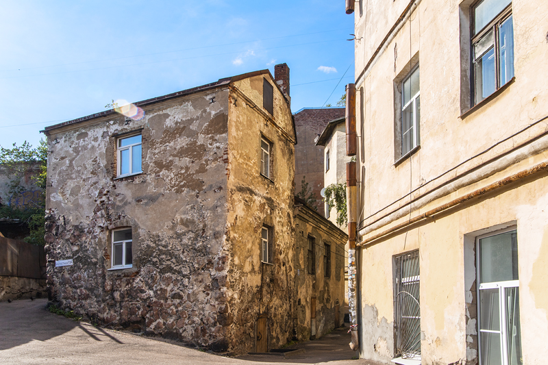 Углом к Выборгской улице и Новой Заставе стоит старейшая каменная постройка города. Она была сложена из необработанного камня еще в XIV веке. Более точную дату вряд ли кто-то скажет, но и сам облик, и рассказы экскурсовода, наведут на мысль, что дом древний. Из многочисленных видоизменений наиболее заметно отсутствие второго этажа. На самом деле фундамент просел, и первый этаж постепенно ушел под землю, превратившись в подвал. В здании раньше проводили переговоры немецкие и шведские купцы, которых в Выборге было довольно много, ведь к XVI столетию он стал важным торговым портом. От гида узнаем, почему дом так своеобразно расположен, и когда он обрел современный облик.