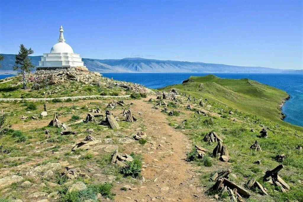 Заглянем на крупнейший остров в Малом море – проливе Байкала, разделяющем большую землю и Ольхон. Только на этой территории нет жителей – в диком месте встретишь разве что птиц и мелких грызунов. Название острова переводится с бурятского как «безводный». На засушливом участке длиной около 3 километров и шириной 500 метров нет ни рек, ни родников. Тем не менее, его привлекательность для туристов очевидна. Искатели истины тянутся сюда ради визита к ступе Просветления. Современное буддистское сооружение создано по строгим канонам. 8-метровая ступа возведена на высоте около 500 метров. Внутри основания хранятся священные рукописи, фрагменты мощей тибетских святых и другие реликвии. Еще более впечатляющее зрелище – мыс Дракон. Кварцевый утес сложен так, что фигура мифического существа легко угадывается. Зимой его украшает сокуй. Так называют уникальное байкальское явление – наплесковый лед, застывающий на скалах. И этому уникальному природному явлению мы станем свидетелями!