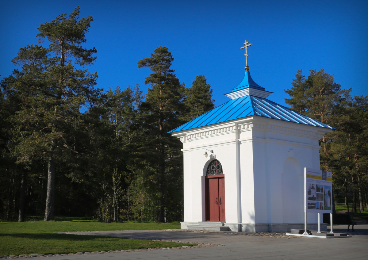 На самом берегу монастырской пристани, куда мы с вами причаливаем, расположилась белоснежная часовня Николая Чудотворца с голубой кровлей, увенчанной крестом. По традиции прибывавшие паломники совершали здесь молебен о благополучном прибытии на остров, ведь Святитель Николай покровительствует всем плавающим и путешествующим. Часовня составляет единый с Монастырской усадьбой, или как её ещё называют каре, ансамбль. Мы узнаем, что представляла из себя часовня во времена военно-морской части, прогуляемся по ведущей от неё кленовой аллее XIX века и полюбуемся окружающими видами.