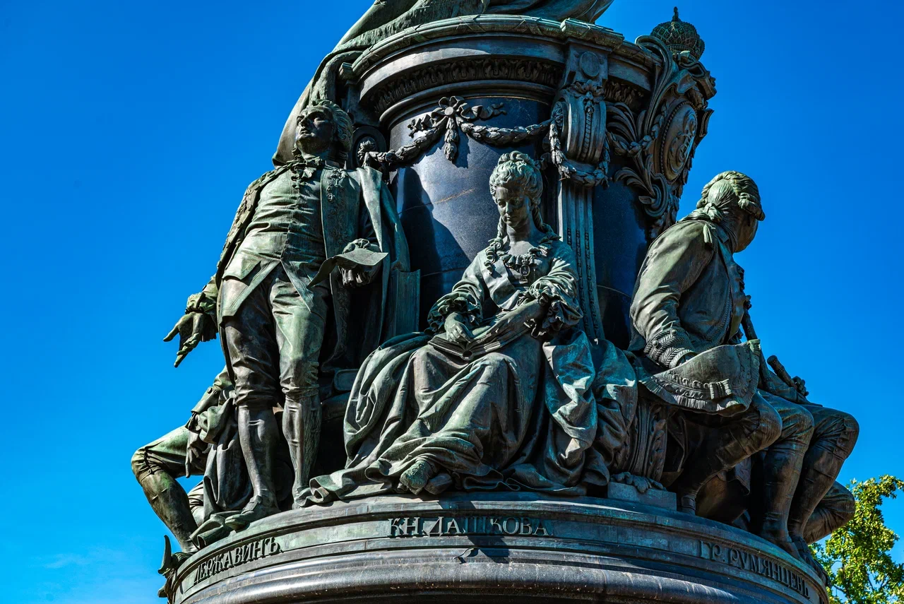 Далее подойдём к знаменитому памятнику Екатерине Великой и отыщем среди бронзовых сподвижников императрицы единственную женскую фигуру – Екатерину Малую.