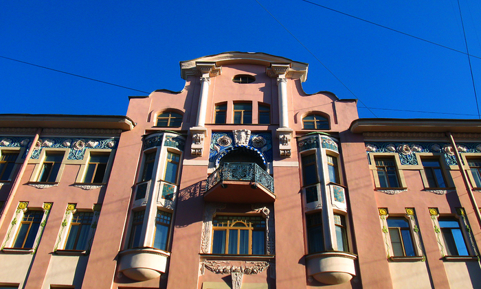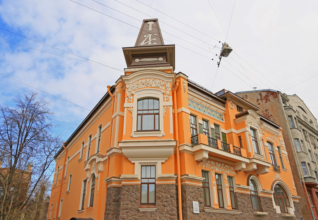 Отправимся на улицу Литераторов, 17 – дом заметен издалека, благодаря башенке и лепному растительному узору. Здесь в начале XX века жили актриса Мария Савина и ее муж, видный театральный деятель Анатолий Молчанов. Декоративные элементы выполнены настолько искусно, что, кажется, будто лепестки и цветки вот-вот начнут колыхаться от ветра.