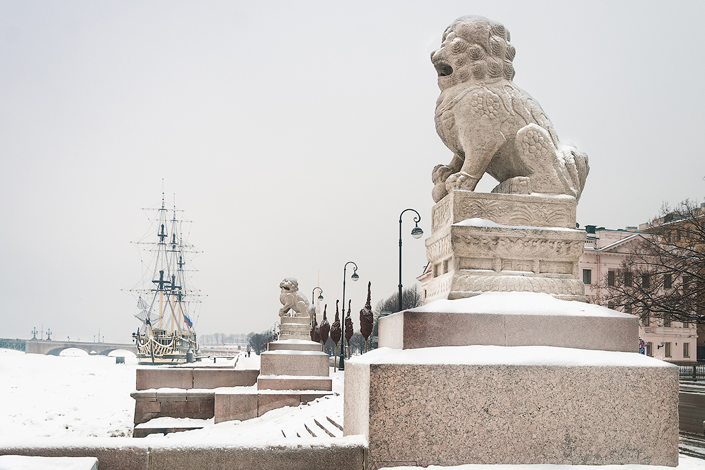 Продолжим изучение восточных мотивов на Петровской набережной. Спуск к реке охраняют китайские львы, каждый из которых весит почти 2,5 тонны. В высоту величественные Цари зверей достигают 4,5 метра. В китайской культуре принято устанавливать фигуры льва по обе стороны от входа в сакральные сооружения. Считается, что лев способен уберегать от злой силы, а шар у него под лапой означает знание, несущее свет во тьму. Также он имеет способность исполнять желания. Установке гранитных стражей предшествовала интересная история. Ее мы услышим от гида в подробностях. Заодно сможем порассуждать, что было бы, если бы львов изобразили с закрытой пастью.
