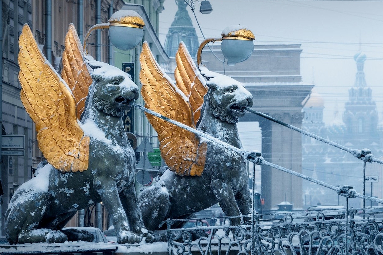 Переместимся к каналу Грибоедова, где обратим внимание на подвесной мост с необычными фигурами. Некогда рядом располагался Ассигнационный государственный банк, потому и мост назвали Банковским. А по краям посадили грифонов с золотыми крыльями. Как известно из древнегреческих мифов, эти чудовища имеют львиное тело, птичьи крылья и голову. По легенде, грифоны способны надежно охранять золото от преступных посягательств. Считалось, что фантастические существа помогут сохранить запасы государства Российского.