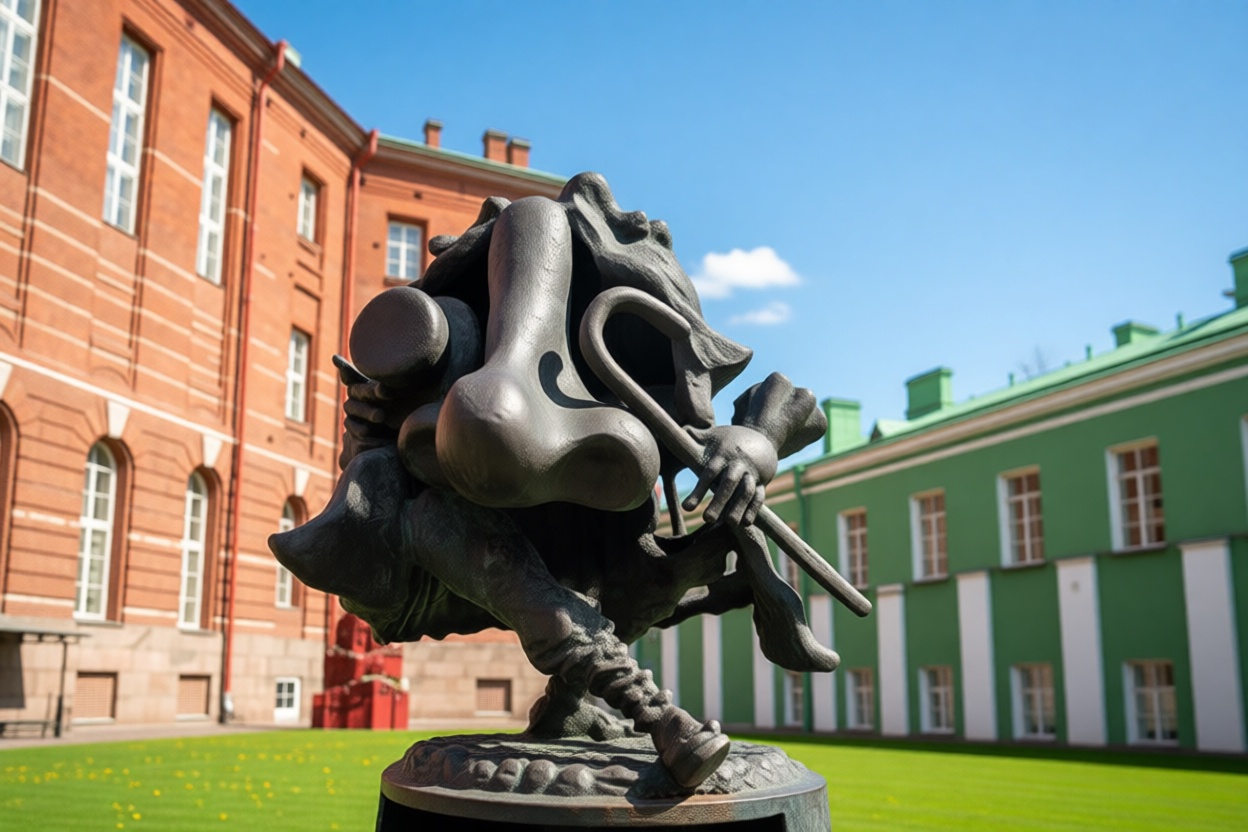 Кульминацией экскурсии станет прогулка по уютному внутреннему дворику Филологического факультета СПбГУ. Студенты изучают изысканную словесность в старинном дворце, историю которого мы обязательно вспомним. На протяжении 20 лет пополняется парк скульптур. Первой из них стала композиция «Размышления о маленьком принце» Арсена Аветисяна. Диковинный персонаж задумался с книгой в руках. В дальнейшем компанию ему составили совершенно разномастные фигуры. Поэтическое сообщество представляют Ахматова, Блок и Бродский. О Гоголе предсказуемо напоминает «Нос» и, внезапно, броненосец. Также встретятся бегемотиха Тоня, единорог и полутораметровая такса. А на «Скамье советов» можно оказаться между ангелом и бесом. Увидим лабиринт из камней, доставленных из крупнейших университетов мира, и Гефсиманский садик со скульптурами по библейским сюжетам.