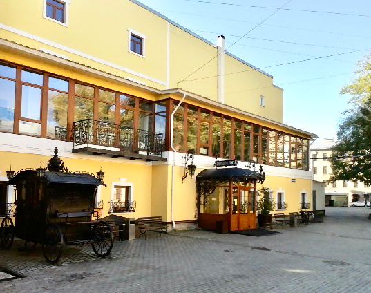 В начале экскурсии увидим, как промышленная зона предприятия «Электролуч» превратилась в уютную гостиницу. По замыслу создателей, обстановка здесь напоминает постоялый двор. Участок еще с начала XX века использовался под промышленные нужды – тут выпускали осветительные приборы. Несколько лет назад было решено создать гостиничный комплекс после реконструкции зданий. Добавились наличники, кованые фонари, двор замостили мелкой плиткой, а вдоль зданий – булыжником. Так удалось воссоздать атмосферу старого европейского города. Местечко тихое и обособленное, но при этом расположенное в центре Северной столицы. В интерьер помещений вписаны элементы кирпичной кладки, а завершают образ гравюры и фотографии с видами старого Петербурга – они позволяют представить, как выглядели известные достопримечательности раньше.