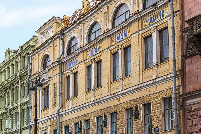 Кульминацией экскурсии станет посещение здания, где живет искусство. Императорское общество поощрения художеств действовало еще со времен правления Николая I. С годами потребовалось строительство штаб-квартиры, где разместились бы школа, мастерские, музей, библиотека и зал для выставок. Император выделил участок на Большой Морской. Активной перестройкой здания занимался Максимилиан Месмахер, а спустя 12 лет объект переоборудовал Иероним Китнер. Простой и изящный фасад мы можем увидеть и сейчас. Изюминкой стали крылатые львы, хранители сокровищ, маскароны с львиными мордами и керамические панно. Большие окна зодчий сделал, чтобы помещения получили максимум естественного света. Внутри пройдем по мозаичному полу к винтовой лестнице, любоваться которой могут только участники экскурсий. Также увидим гигантский фонарь производства завода Франца Сан-Галли и витраж над потолком с изображением богини Афины. На втором этаже осмотрим роскошные двери, фонари и потолки, поддерживаемые мощными кронштейнами.