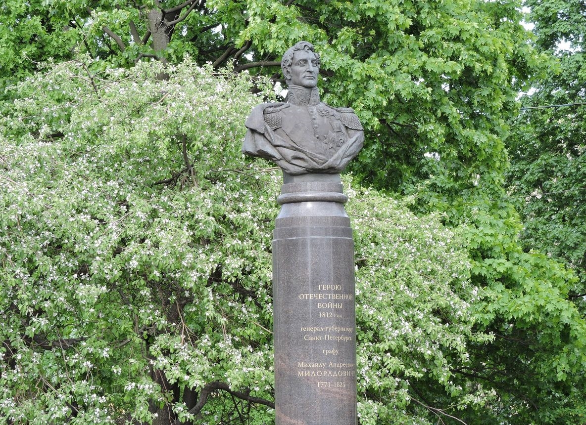 Переместимся в Московский сад, где полюбуемся бюстом Михаила Милорадовича – этот монумент возвышается на 5 метров. Блестящий военный и грамотный градоначальник – таким вспоминали графа современники. Всегда изысканно одетый щеголь, он мог даже под свист пуль курить трубку, поправлять амуницию и отпускать шуточки. Любимый ученик Александра Суворова отличился в нескольких важных для страны сражениях. О подвигах на военном и гражданском поприщах подробнее услышим во время прогулки.
