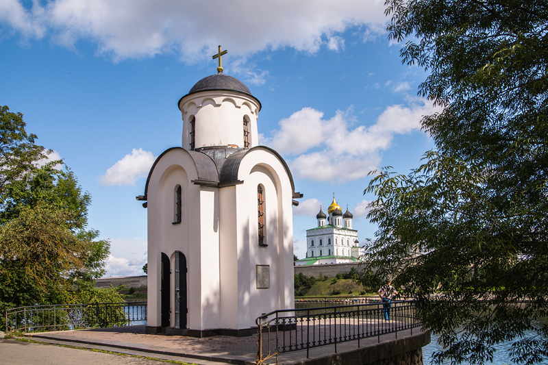 Прогуляемся по Ольгинской набережной, где увидим достопримечательности, установленные в честь основательницы города. Житие княгини гласит, что в этом месте она увидела осветившийся вдруг лесистый мыс на противоположном берегу. Ольга посчитала знамение добрым знаком и велела построить там Плесков град – будущий Псков, и Троицкий собор. А здесь вкопали памятный крест и поставили часовню. Святыню разрушили в 1960 году, но 40 лет спустя возродили. Новую часовню возвели на искусственной площадке напротив Кремля. Посетим это место и запомним облик часовни, чтобы потом сравнить ее с Собором Иоанна Предтечи. По краям полукруглой стены смотровой площадки две лестницы ведут к нише, откуда бежит освященная вода. Ольгин крест на берегу Великой реки вырезали по контуру деревянного образца – реликвии, хранящейся в Троицком соборе.