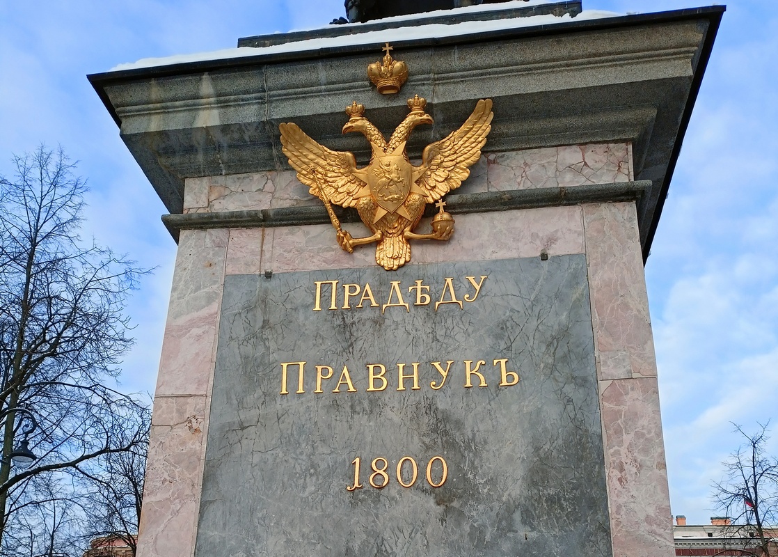 У памятника Петру Первому перед Михайловским замком вспомним закон 1722 года о назначении преемника царствующим монархом, обусловивший процветание придворных интриг и вызвавший ожесточённую борьбу за царский трон. Только через восемьдесят лет император Павел исправил «ошибку» прадеда: исключил лазейки для самозванцев и обеспечил легитимную передачу власти на весь последующий период монархии (до февраля 1917 года).