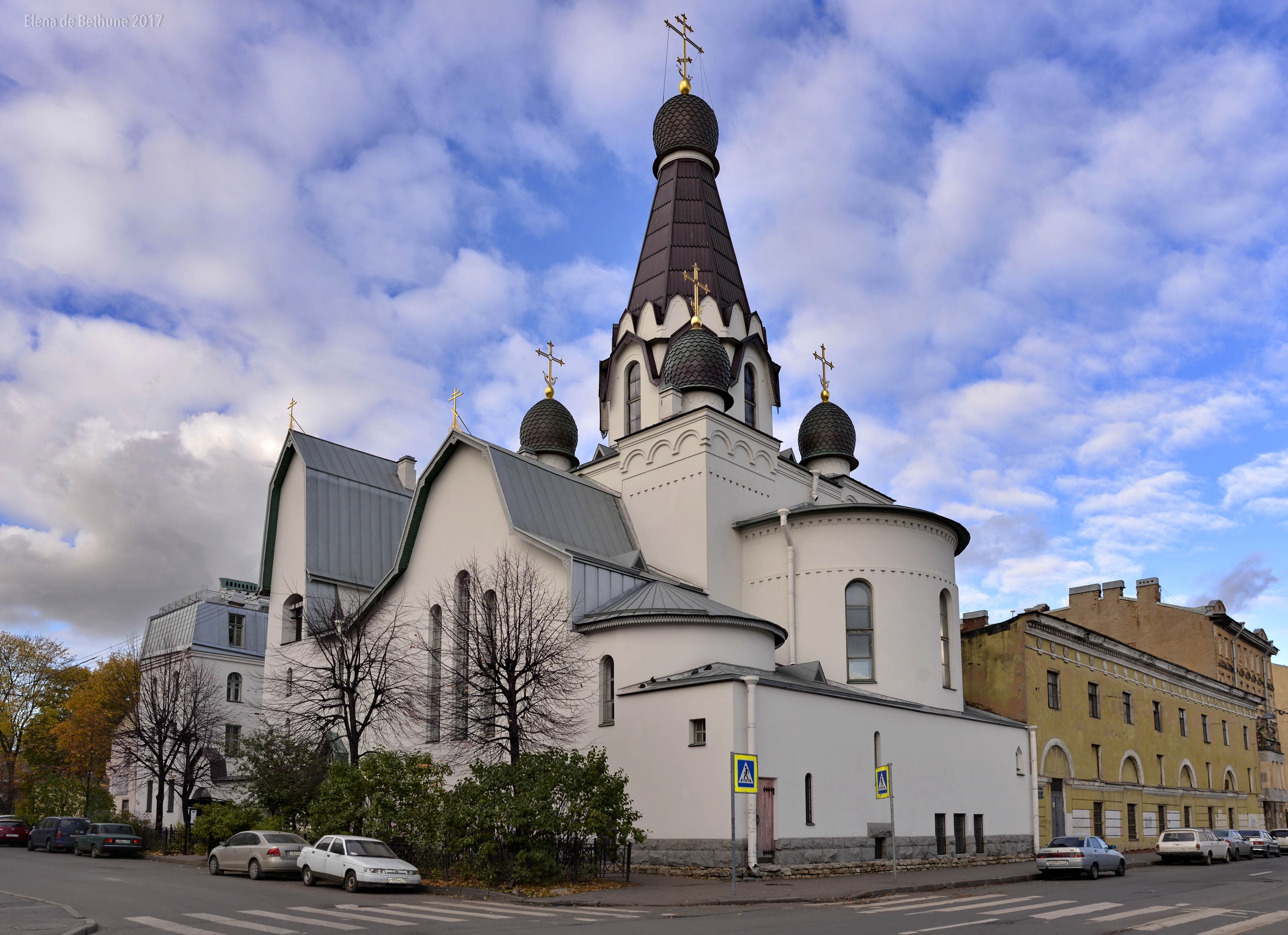 Наша экскурсия начинается с возвышающейся белой церкви с шатровым завершением — Храма Святителя Петра Митрополита Московского на углу Роменской и Днепропетровской улиц! Это бывшее подворье Свято-Троицкого Творожковского монастыря. В Санкт-Петербурге Творожковский монастырь имел два подворья — одно на Старой Деревне, другое, которое мы с вами осмотрим — недалеко от Московского вокзала. Мы полюбуемся редкой особенностью архитектуры подворья — сочетание стилизованных деталей и композиции, свойственных зодчеству Древней Руси.