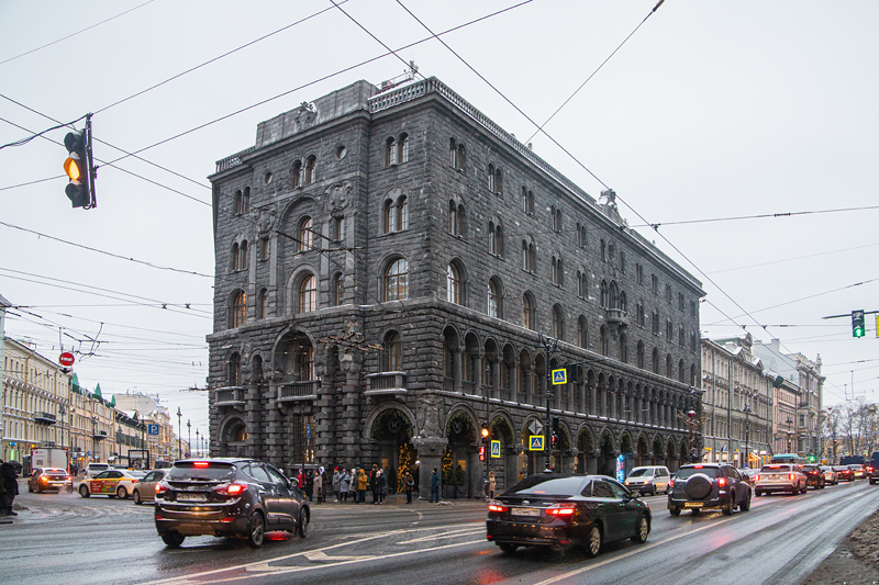 Здание на Невском, 7, построили по просьбе купца Михаила Вавельберга. Он разместил здесь Санкт-Петербургский торговый банк. Часть помещений заняли жилые комнаты главы семейства и его родных, часть этажей приспособили для банка, а также фабрики геодезических и чертежных инструментов «Герлах». О требовательности и придирчивости банкира ходили легенды. По одной из них, принимая объект, он долго и тщательно его осматривал, но не нашел, к чему придраться. Придумал только одно замечание – попросил переделать табличку на дверях «толкать от себя». Богач попросил исправить «тянуть к себе». Нашим современникам здание кажется мрачноватым, но есть и любопытные детали – оно облицовано серым сердобольским гранитом, добытым в каменоломнях близ Сортавалы. Во всю высоту фасады банка отделаны колоннами, пилястрами, резными деталями и барельефами.
