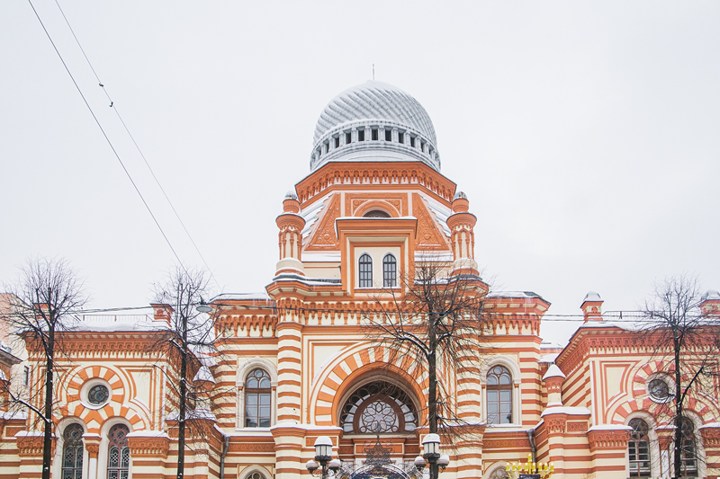 Перед трапезой совершим экскурсию по Большой Хоральной Синагоге. Она выделяется среди себе подобных. В Израиле синагоги выглядят скромно, а в нашем городе – масштабно и завораживающе. Краснокирпичное здание в неомавританском стиле с лепниной просто невозможно не заметить. По величине оно является крупнейшим в России и вторым в Европе.
