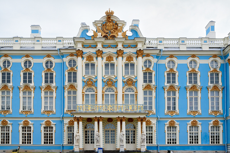 Большой Екатерининский дворец – воплощенный в камне гимн, воспевающий барокко. Бессмертное творение великого Растрелли! Гости императорской семьи застывали перед ним с широко открытыми глазами: бесконечное здание с колоннадами, лепниной, бело-голубыми фасадами в сочетании с ослепляющим золотом поражало каждого. Елизавета Петровна не жалела на него денег: только на позолоту фасада и статуй ушло около 100 килограммов золота.