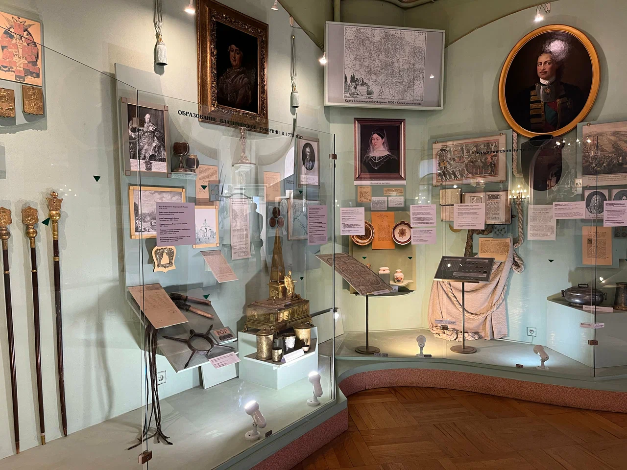 Посетим музей, где размещается экспозиция, повествующая об истории Владимирского края с раннего средневековья до Революции 1917 года. Часть залов занимают археологические находки, среди которых много артефактов эпохи правления Андрея Боголюбского и Всеволода Большое Гнездо: бытовые вещи, предметы культа и даже фрагменты резного декора памятников белокаменного зодчества. Кроме того, здесь выставлен макет древнерусского Владимира. Глядя на него, удастся представить облик города непосредственно перед нашествием монгольских завоевателей. На втором этаже экспонаты рассказывают о событиях XVII-XX веков, среди которых участие городов Владимирской земли в событиях Смутного времени и развитие края в составе Российской империи. Также познакомимся с традиционными ремеслами и продукцией промпредприятий дореволюционной Владимирской губернии и поговорим и о знаменитых людях, оставивших значительный след в истории страны.