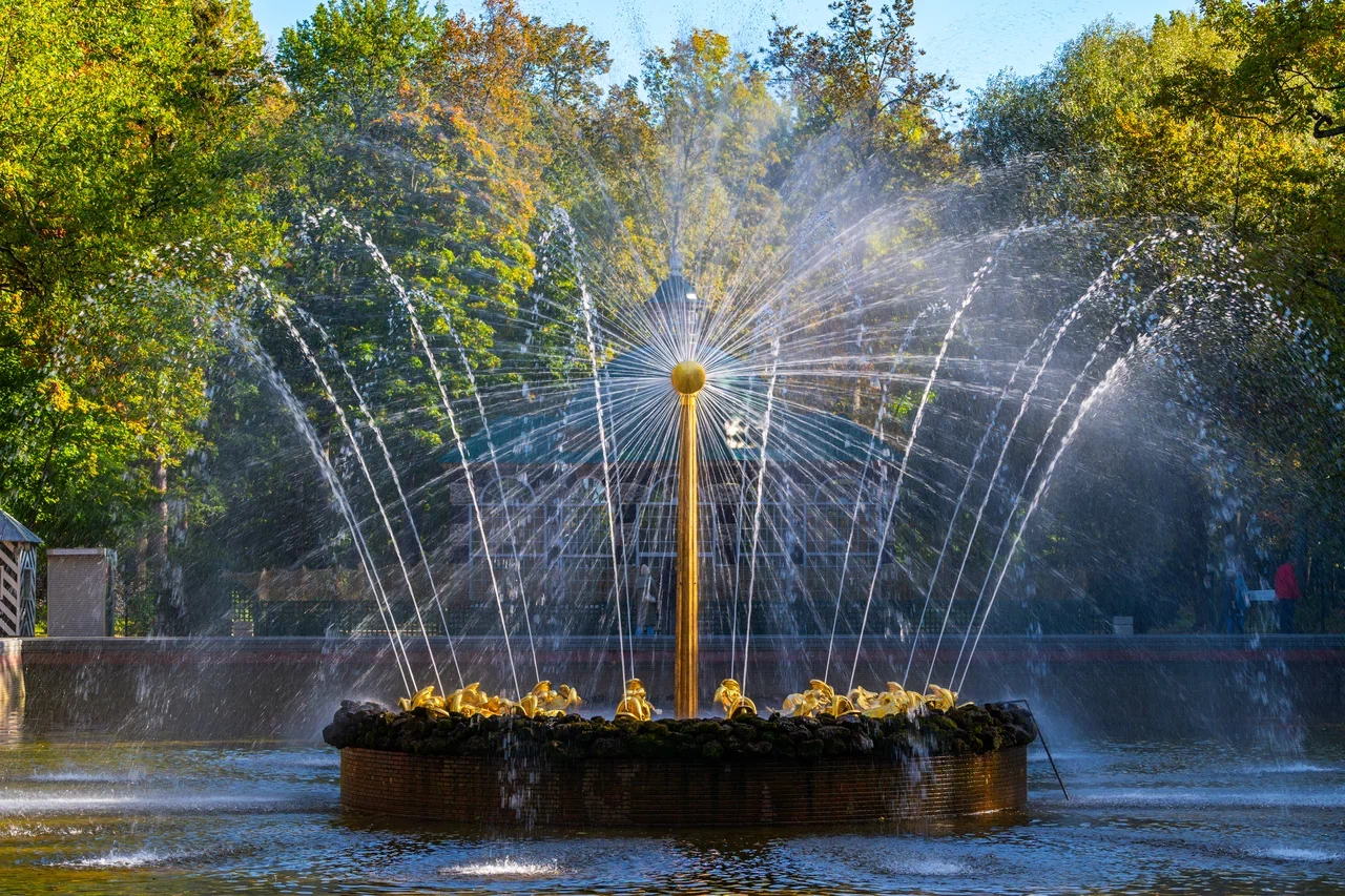 Будем любоваться прозрачными завесами фонтанов, вспоминать о праздниках и забавах 18-го века, пробежим под ажурной водяной аркой из трёх сотен высоких струй,