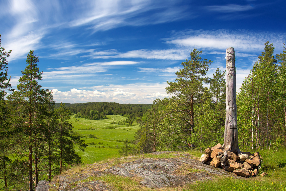 Мы поднимемся на холм, с которого открывается потрясающий вид на окрестности. Дух захватывает! А деревянные идолы делают это место особенно «сильным». Согласно легендам, здесь находилось языческое капище. «Подлечившись» у камней (по преданиям, они лечат болезни спины и сердца), идем на обед в гостевой дом «Курки».