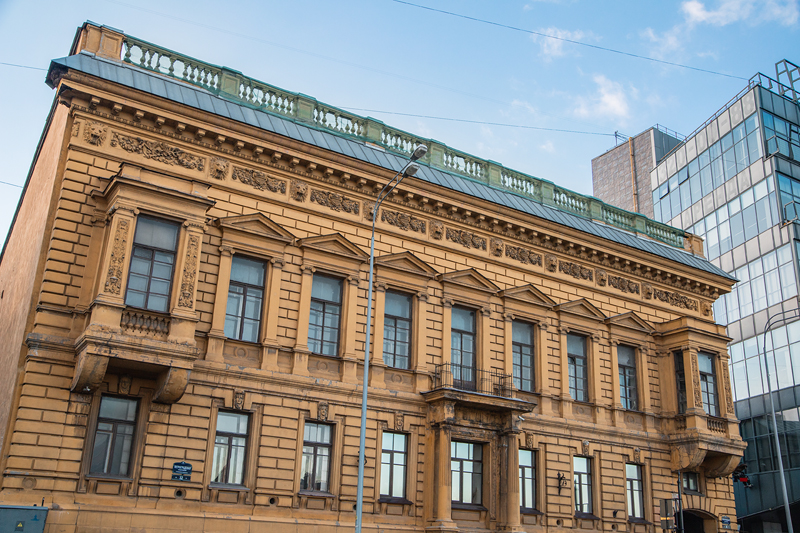 Побываем в здании, перестроенном по проекту Василия Шауба. Это один из первых архитекторов Петербурга, начавших работать в стиле модерн. Заказчиком выступал владелец фортепианной фабрики Карл Шредер, а работы велись в 1888-1889 годах. Привлекают внимания эркеры на втором этаже, центральный портал с колоннами и окна в обрамлении пилястров и сандриков. На фасаде также виднеется фриз с львиными масками. Не менее причудливо оформление интерьеров, и мы в этом убедимся лично. Увидим великолепную лепнину и роспись потолков, сохранившиеся части подлинных деталей архитектурного убранства.