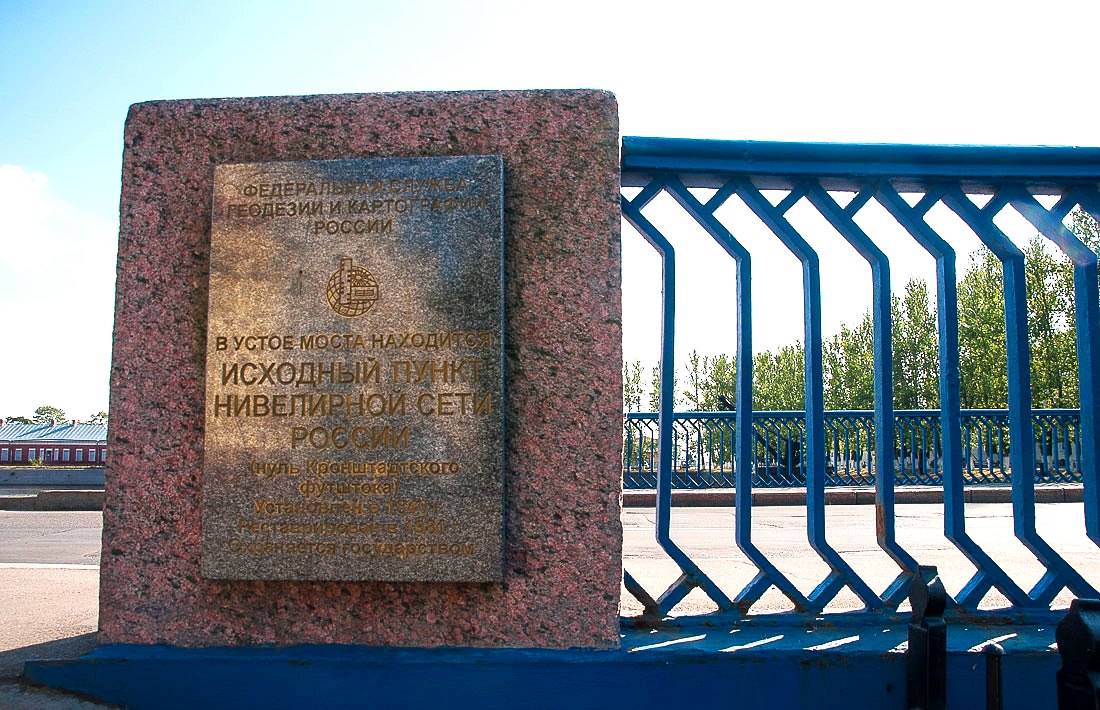 Далее мы направимся к Синему мосту и посмотрим на его опоры. Это место для России воистину играет роль «пупа Земли», как однажды назвал его Юрий Гагарин. Именно здесь, где плещутся воды Обводного канала, на одной из устой располагается объект, о существовании которого знает каждый отечественный геодезист, топограф или землемер – Кронштадтский футшток или ординар. Футшток измеряет высоту уровня воды Балтийского моря. Именно отсюда отсчитывают все глубины, высоты и орбиты космических кораблей.
