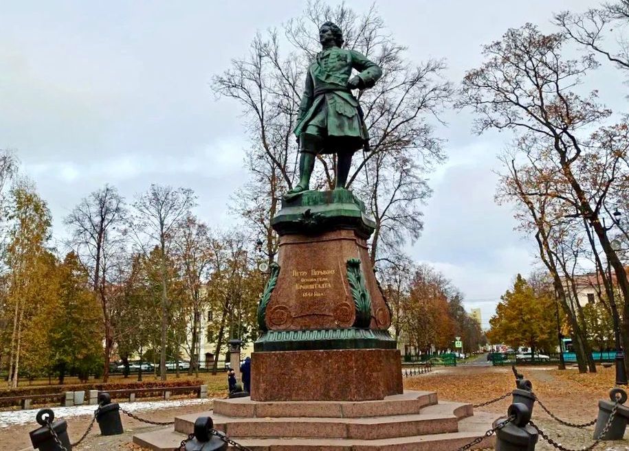 В самом сердце Кронштадта есть место, пронизанное тишиной и спокойствием, это Петровский парк, который иногда называют местом встречи романтиков. В центре его, по велению Николая I, установлен памятник основателю города Петру I. Мы прогуляемся по уютным аллеям и выйдем к набережной парка и Петровской пристани. В военные годы здесь традиционно собирались родные и близкие моряков, уходивших в боевые походы, чтобы проводить их и пожелать «счастливого плавания». Здесь же встречали всех почётных гостей, в том числе и из-за рубежа, например, командующих эскадрами и моряков кораблей Франции, Англии, Германии, приходивших в Кронштадт с дружественными визитами.