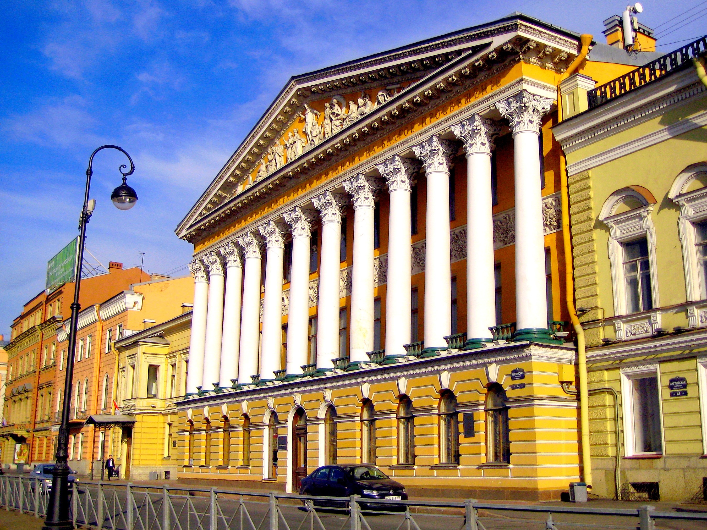 Напоследок побываем на Английской набережной и посетим приметное здание с белыми колоннами. Современному облику оно во многом обязано Зинаиде Богарне – сестре генерала Скобелева, супруге герцога Лейхтенбергского. Девушка в юности подолгу жила в Париже вместе с матерью и получила французское воспитание. Светская красавица славилась хорошим голосом и даже училась петь у Полины Виардо. После свадьбы с герцогом получила титул графини Богарне.